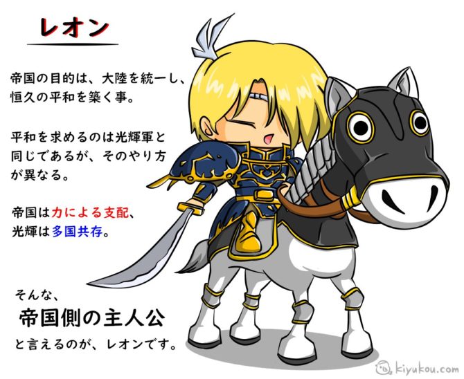 例えば「レオン」という「レイガルド帝国」の指揮官は、ハンサムで強くて騎士道精神にあふれた魅力的な敵キャラであり、おそらく誰もが「味方だったらいいのに…」と思ってしまう人物設定なのですが、条件を満たすとそんな彼と共にストーリーを進めることもできてしまうのです。